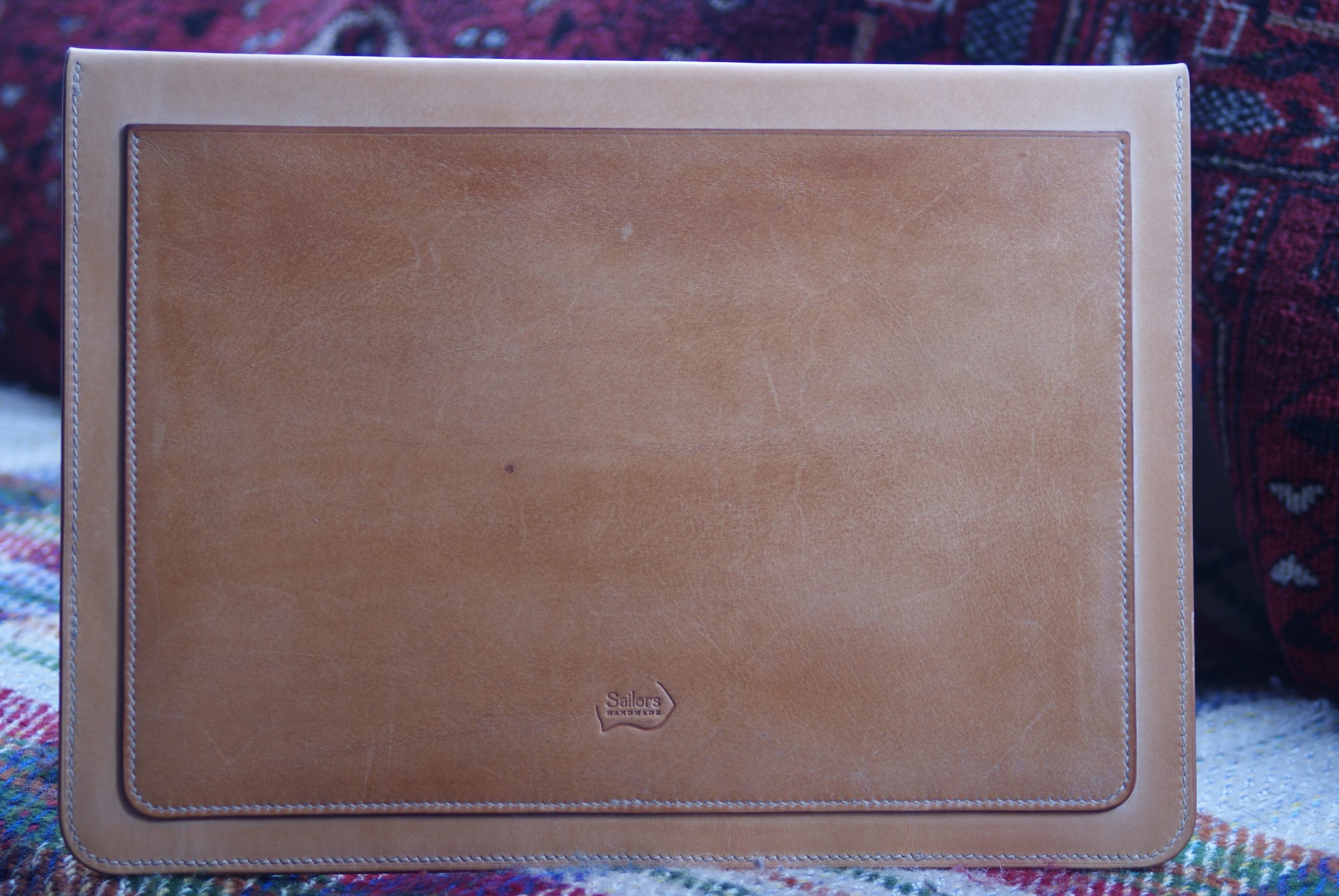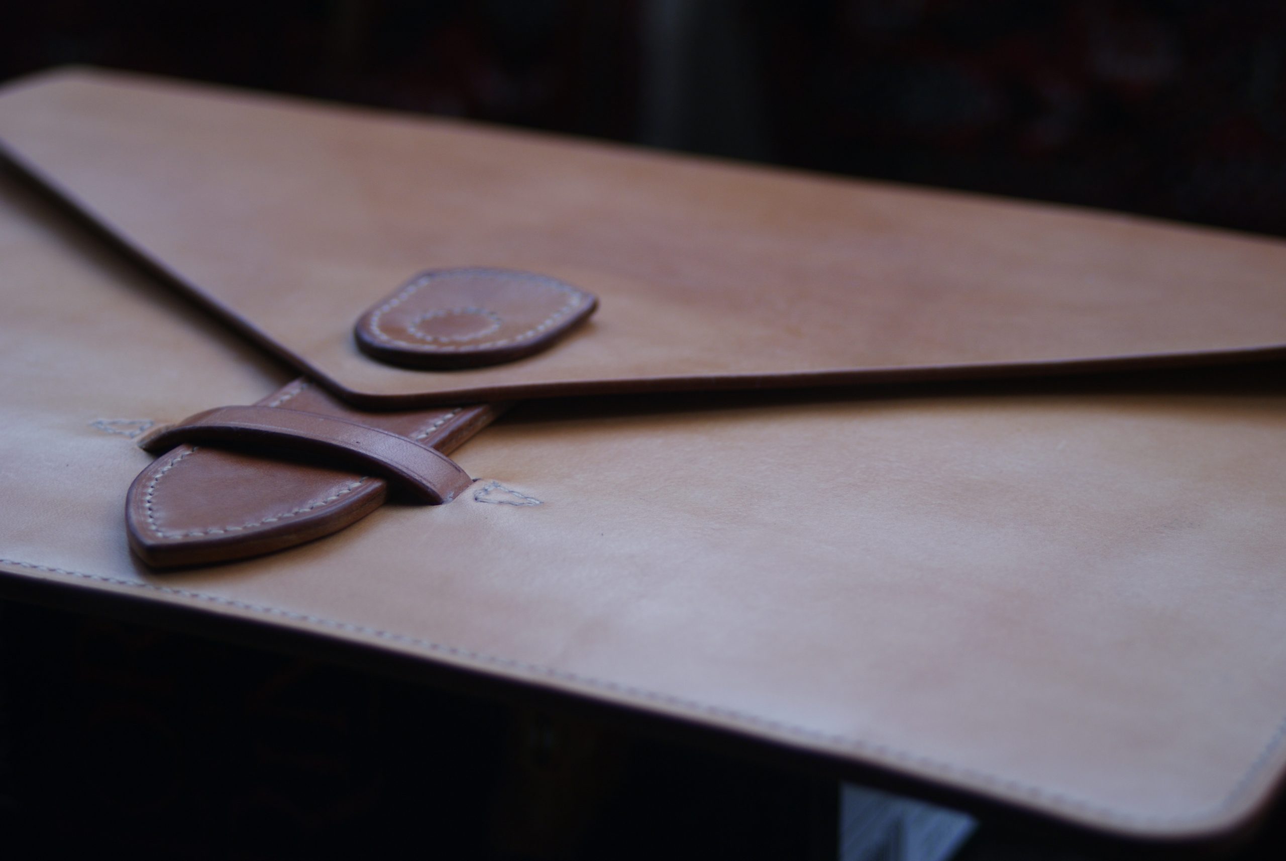 Pictured: Russet leather laptop sleeve with rear closure, rear pocket and simple closure mechanism. Unlined. Hand stitched with pure linen thread.