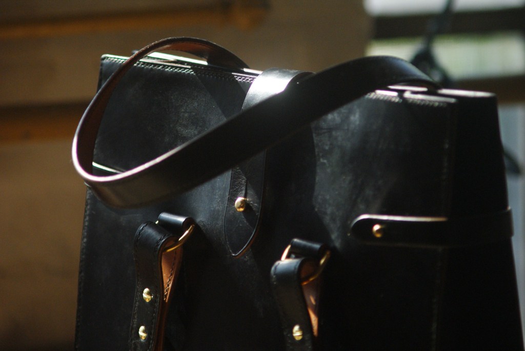 The details. The Mini Tote is 14% smaller in width and height than the large tote. The depth is the same at 110mm. I chose to stick with the black on brass combination because I already knew this combination was working for most people. The combination fits in well in any situation. Being smaller means it can be carried comfortably under the arm, not only by ones side. Furthermore I wanted to see how it would work as a backpack, hence the addition of the loops at the bottom on one side. To enable the conversion to a backpack the handles are detachable. They are lined and stitched fully to make them more comfortable and long lasting. For people who have narrow shoulders the straps can be crossed over giving a more secure fit. All of the handles and straps are removable offering the option to change them to a different colour.