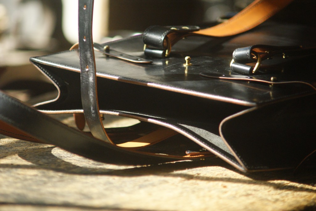 Some background. I received a customer commission a couple of years ago for a large, slimline tote bag, big enough, among other things, for a weekend away, the day at the office and for general daily use. The prototype was made with black English bridle leather with brass hardware (feet, d-rings and sam browne studs). The customer commission was made with oak bark tanned bridle leather from J & FJ Baker tannery. The prototype was meant for sale except that I managed to damage it rendering it un-salable. I started using it and fell in love with it instantly. The size, stiffness and versatility offered by the side straps and closure method meant that I could carry my flask, documents, lunchbox, laptop and stationery with room to spare for things picked up along the way. Everything stays in its place and is easily accessible.